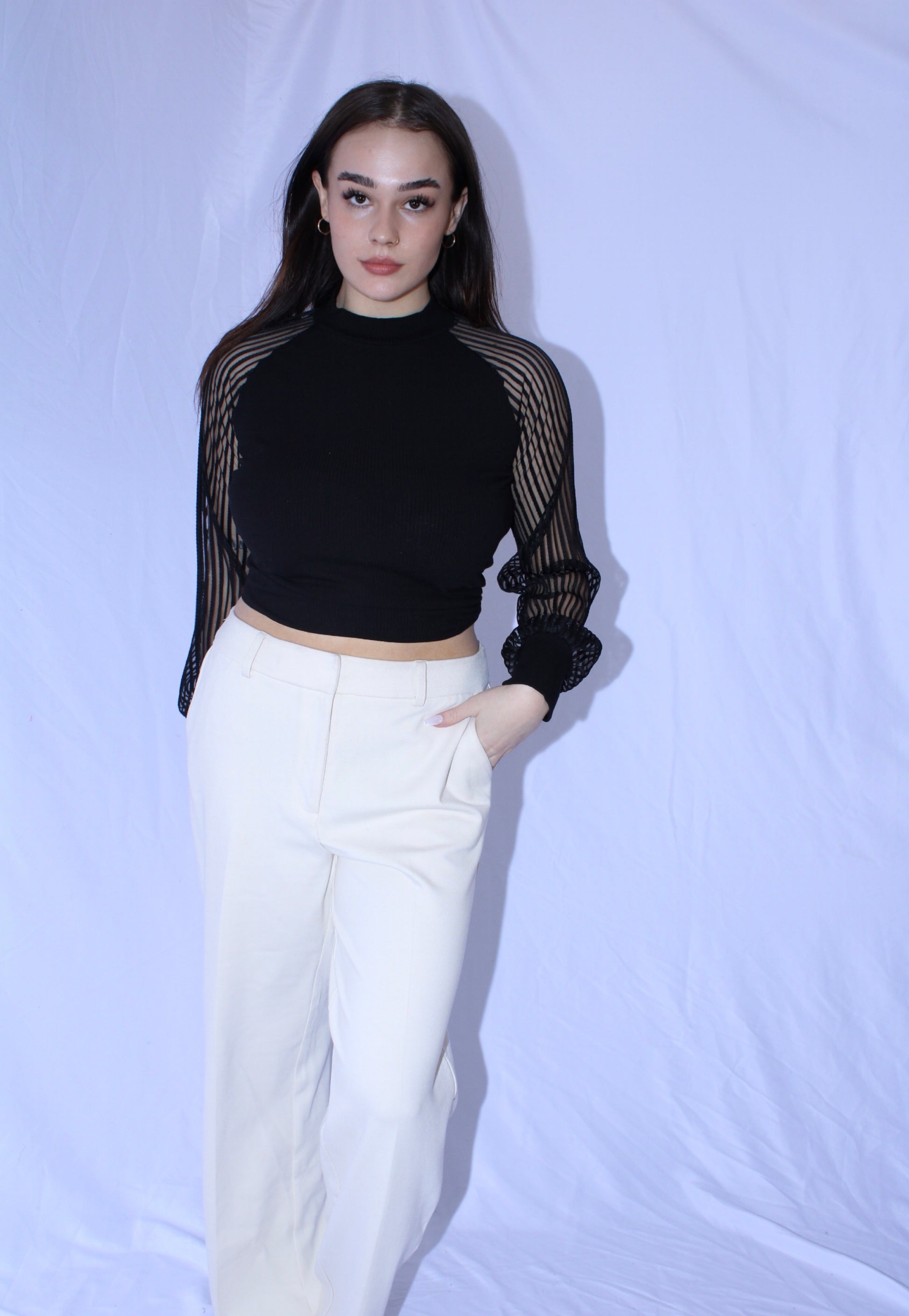 Black long sleeve with mesh ribbed sleeves, soft cotton material. Easily dressed up or down.